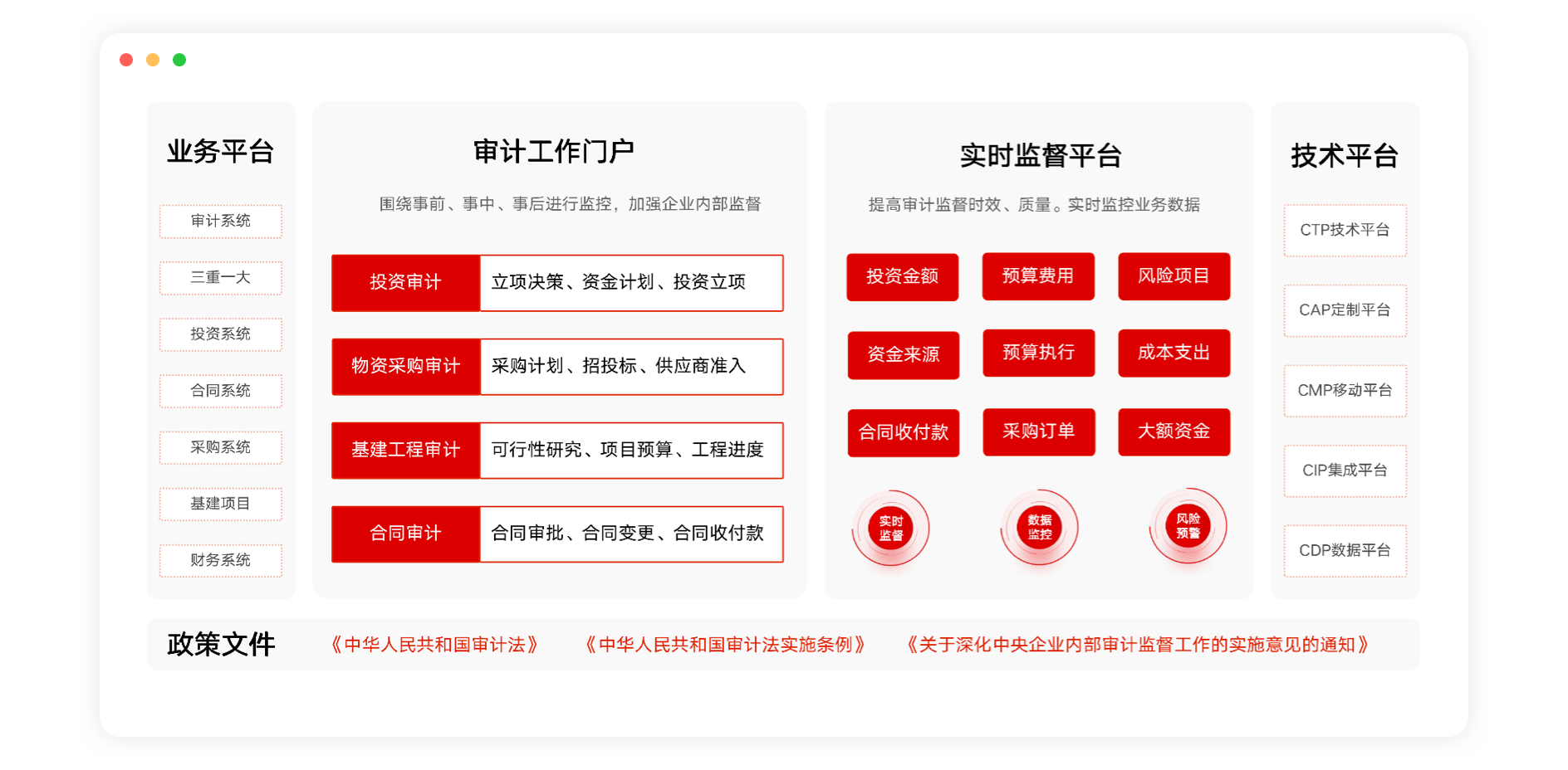 致远【业审一体化平台解决方案】,旨在构建与“三重一大”决策、投资、财务、资金、运营、内控等业务信息系统相融合的“业审一体”信息化平台,使传统的事后审计向事前预警、事中审计演进。根据审计人员层级赋予相应的数据查询权限,让审计人员实时参与到对业务过程的监管中,随时开展审计监督、跟踪反馈,实现“全业务、全流程、全要素”监控,推动内部审计监督无死角、全覆盖,促进内部审计提能增效、业务风险有效管控。