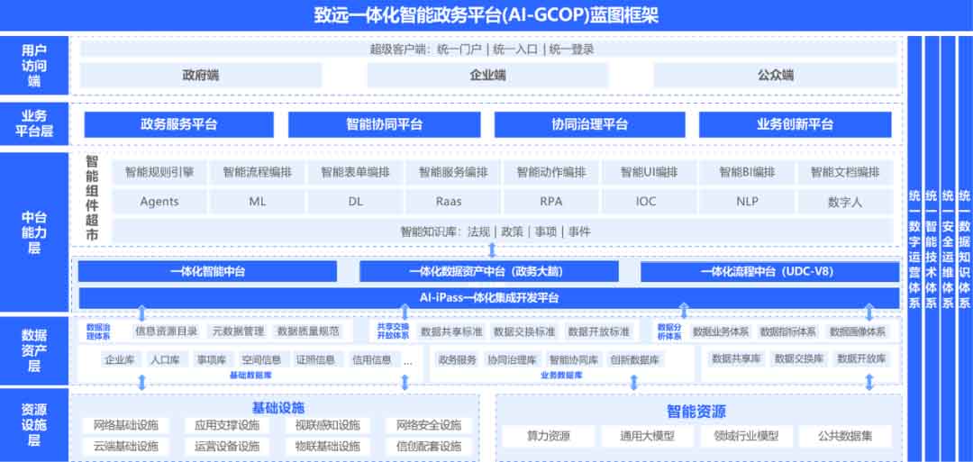 致远以“1344”体系架构推出具有强大开放、集成能力的一体化智能政务平台(AI-GCOP),平台以云原生、微服务、AI大模型为基础能力,以一体化数据资产中台(政务大脑)、一体化智能中台、一体化流程中台以及一体化集成开发平台为能力支撑,融合Agents、RPA、NLP、数字人等智能组件,形成政务服务平台、智能协同平台、协同治理平台、业务创新平台四大平台,全面覆盖一网协同、数字乡村、数字机关、内网移动办公、智能公文、数字人大、智慧统战、党建网格化、智慧民政等数字政府各行业领域解决方案。从平台技术、应用架构到场景创新、生态体系,实现全面突破创新,打造致远政务新质生产力。