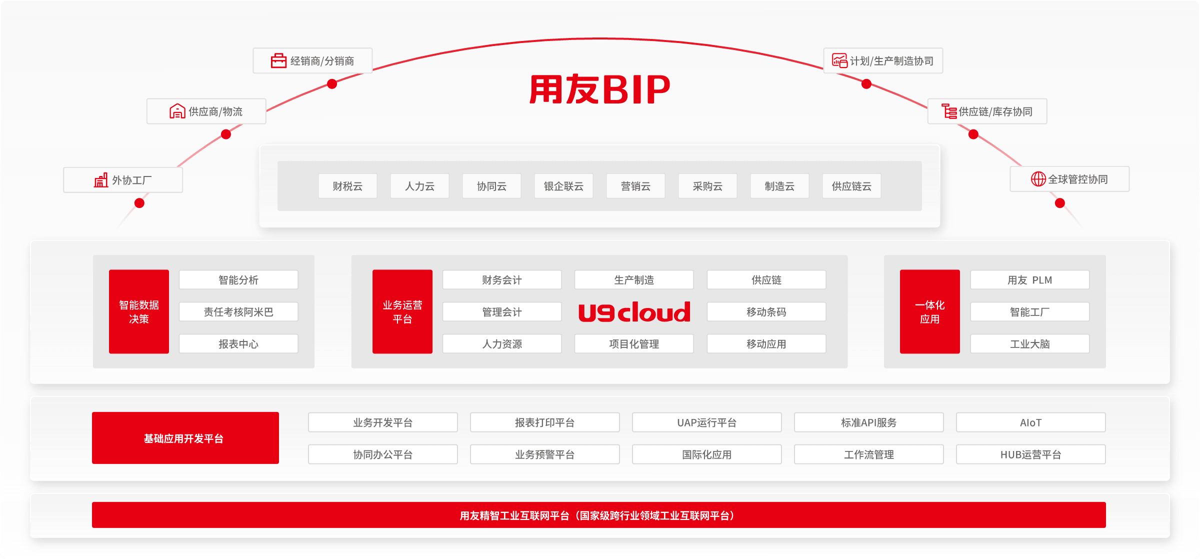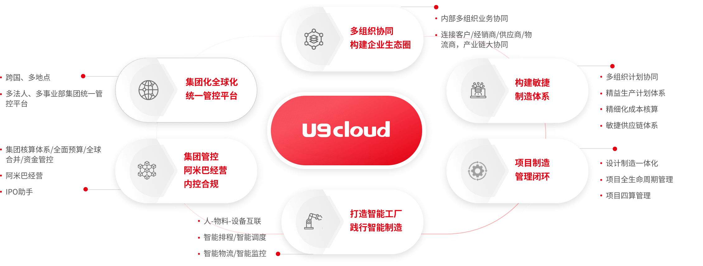U9 cloud聚焦中型和中大型制造企业,全面支持业财税档一体化、设计制造一体化、计划执行一体化、营销服务一体化、项目制造一体化等数智制造场景,赋能组织变革和商业创新,融合产业互联网资源实现连接、共享、协同,助力制造企业高质量发展。