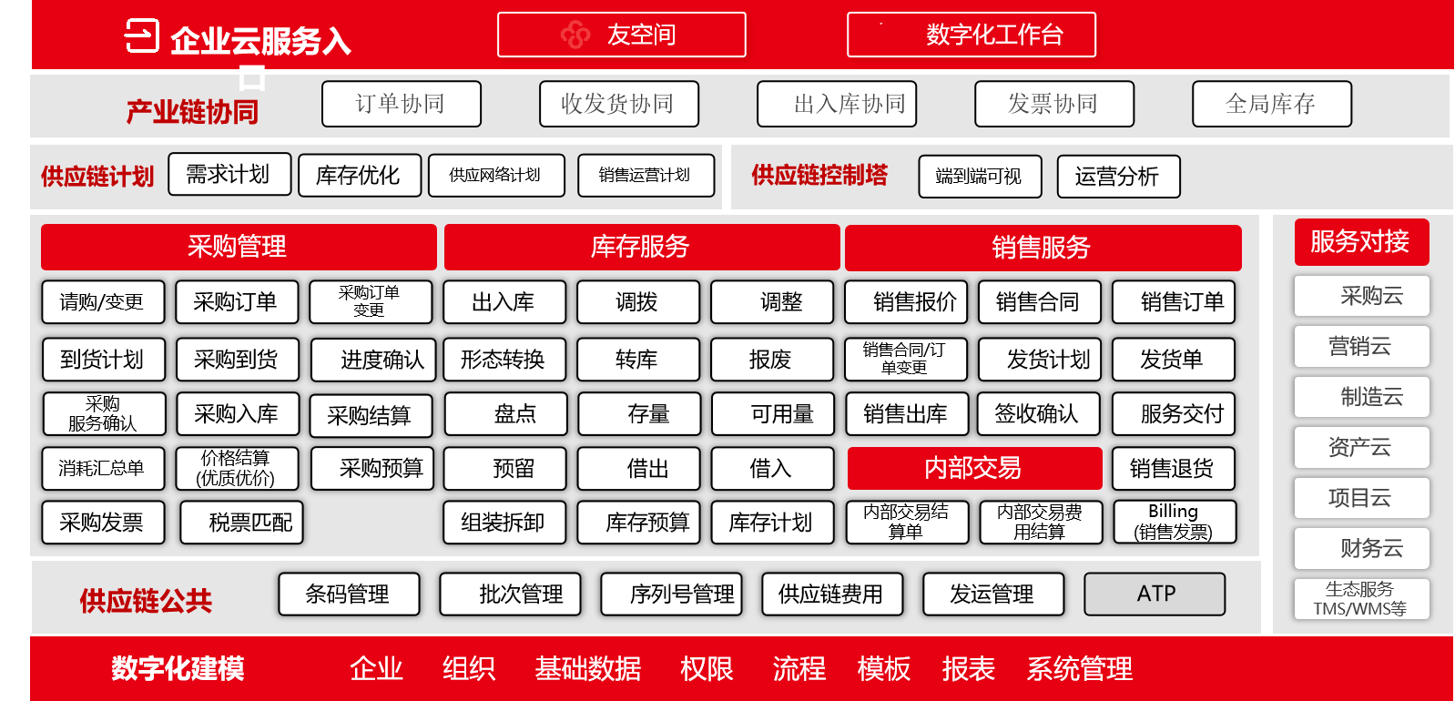 供应链云将计划、采购、生产、销售、库存、服务等活动紧密衔接在一起,提供完整供应链服务,实现企业内部产供销、业财税一体化。通过社会化集成计划与网络协同,将上游与下游企业涉及的供应商、生产商、分销商等企业间的商流、物流、信息流、资金流形成一体化运作。通过开放的生态融合服务,为企业提供更完善的供应链服务,从而不断提升企业供应链管理水平,实现敏捷供应、高效协同